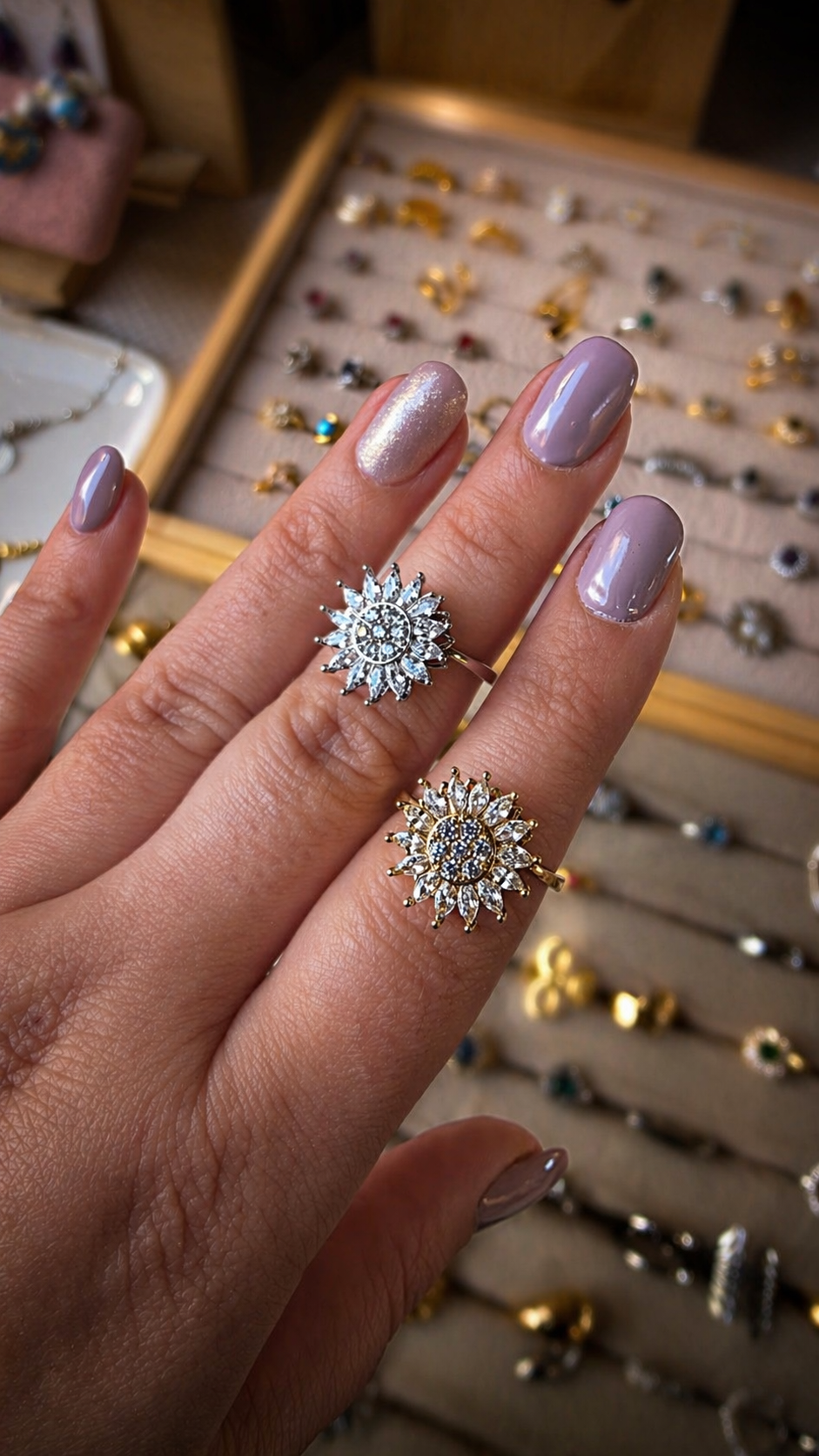 Un anello luminoso e raffinato, realizzato in acciaio inossidabile, con design regolabile per adattarsi perfettamente a ogni dito. Il suo castone a forma di fiore, ricco di dettagli scintillanti, è girevole: un piccolo gesto che lo trasforma in un elegante antistress da indossare ogni giorno ✨