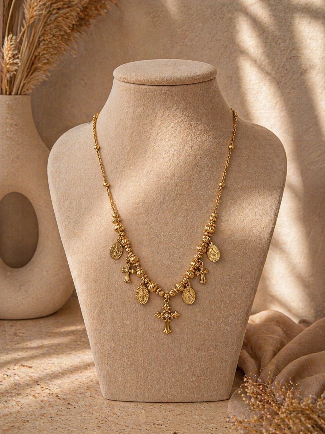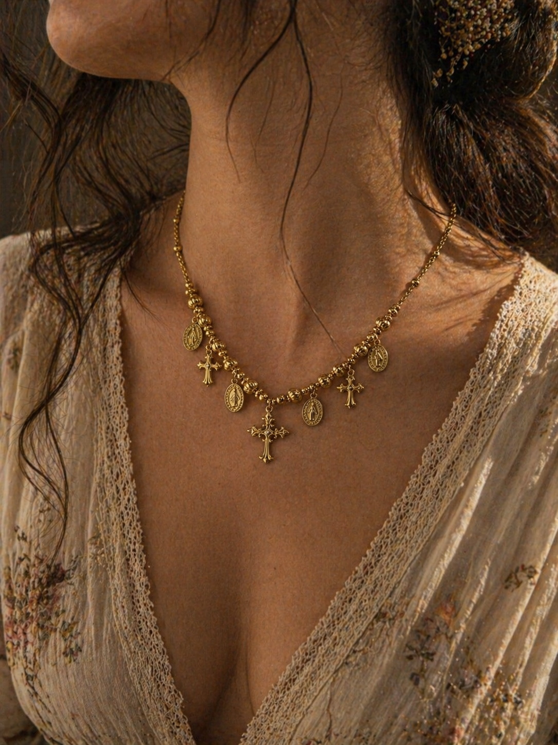 Questa collana racchiude un insieme di piccoli talismani dal significato profondo: medaglie sacre, dettagli dorati e una croce centrale che diventa punto focale e guida. Ogni elemento racconta una storia di protezione, fede e connessione interiore.